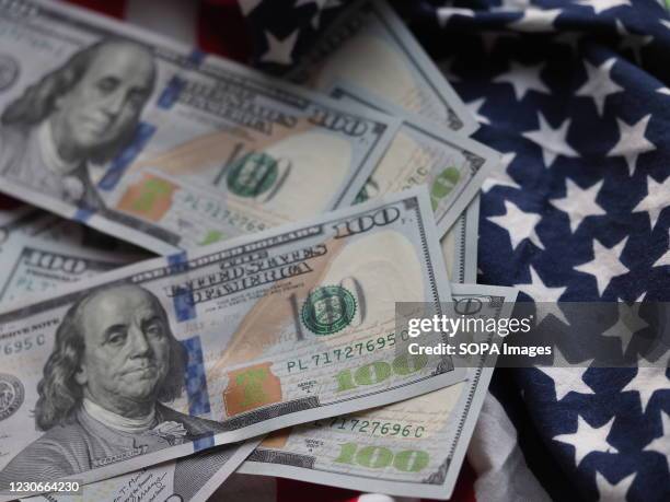 In this photo illustration, US 100 dollar bills seen on an American flag. (Photo Illustration by Igor Golovniov/SOPA Images/LightRocket via Getty Images)